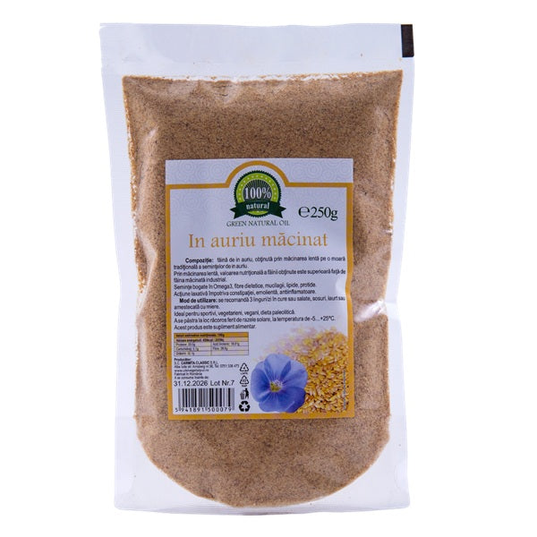 Seminte de in aurii macinate, bogate in fibre si Omega-3, ideale pentru adaugarea in iaurt, smoothie sau produse de panificatie.
