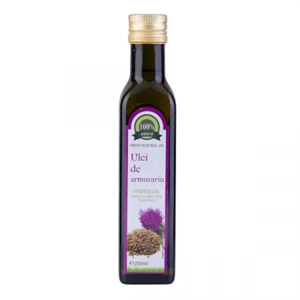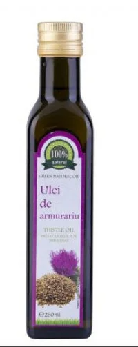 100% ulei pur de armurariu presat la rece, din seminte de armurariu, netratate termic, atent selectionate, foarte bogat in substante flavonoide denumite colectiv "silimarina", care a dovedit in timp proprietati hepatoprotectoare de exceptie din care fac parte silibina (cantitatea cea mai mare), izosilibina, silidianina, silicristina, taxifolina. Se recomanda minim 3 linguri/zi.Se foloseste si in cure sau preparate culinare delicate, precum salate sau sosuri.